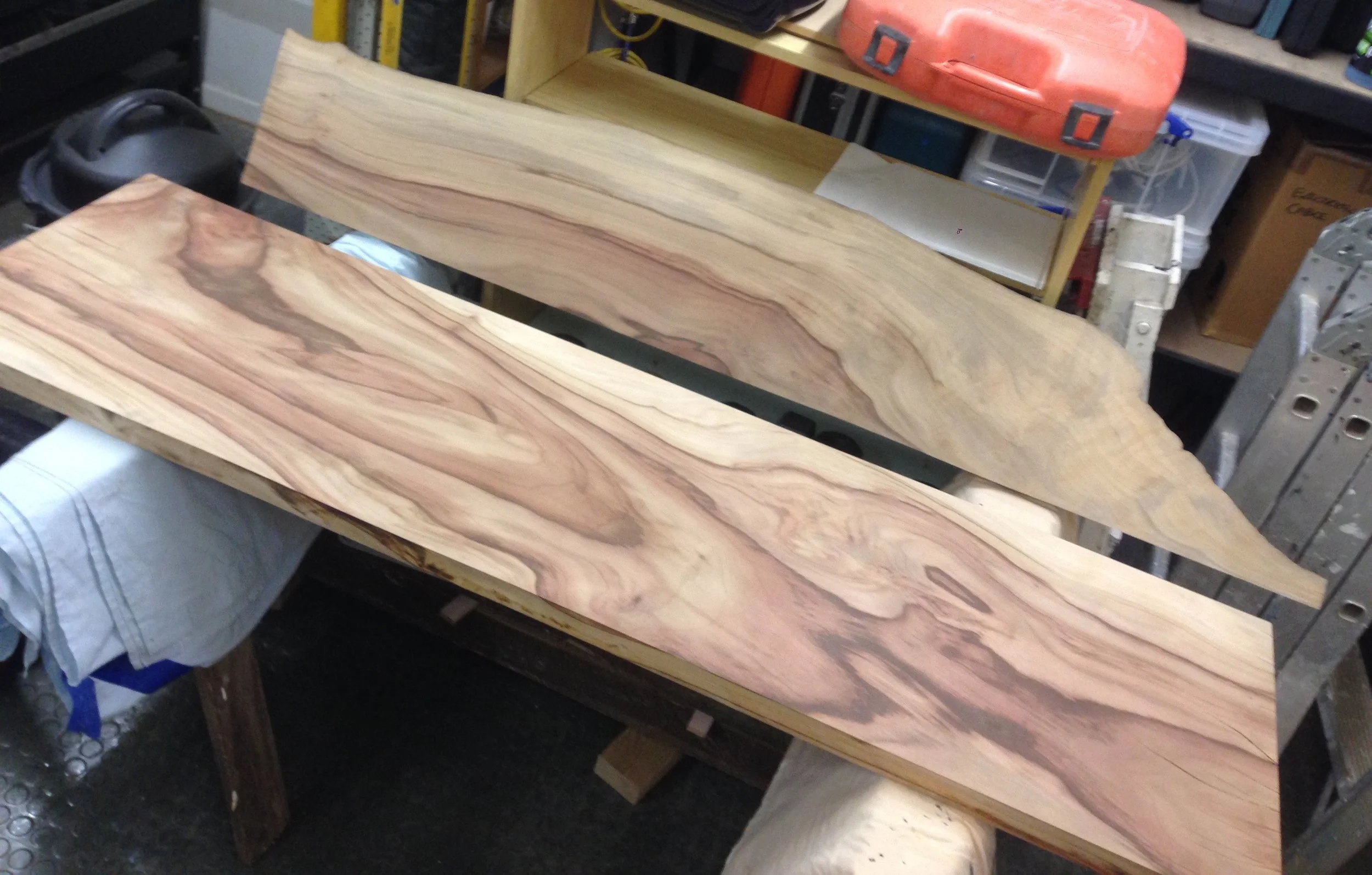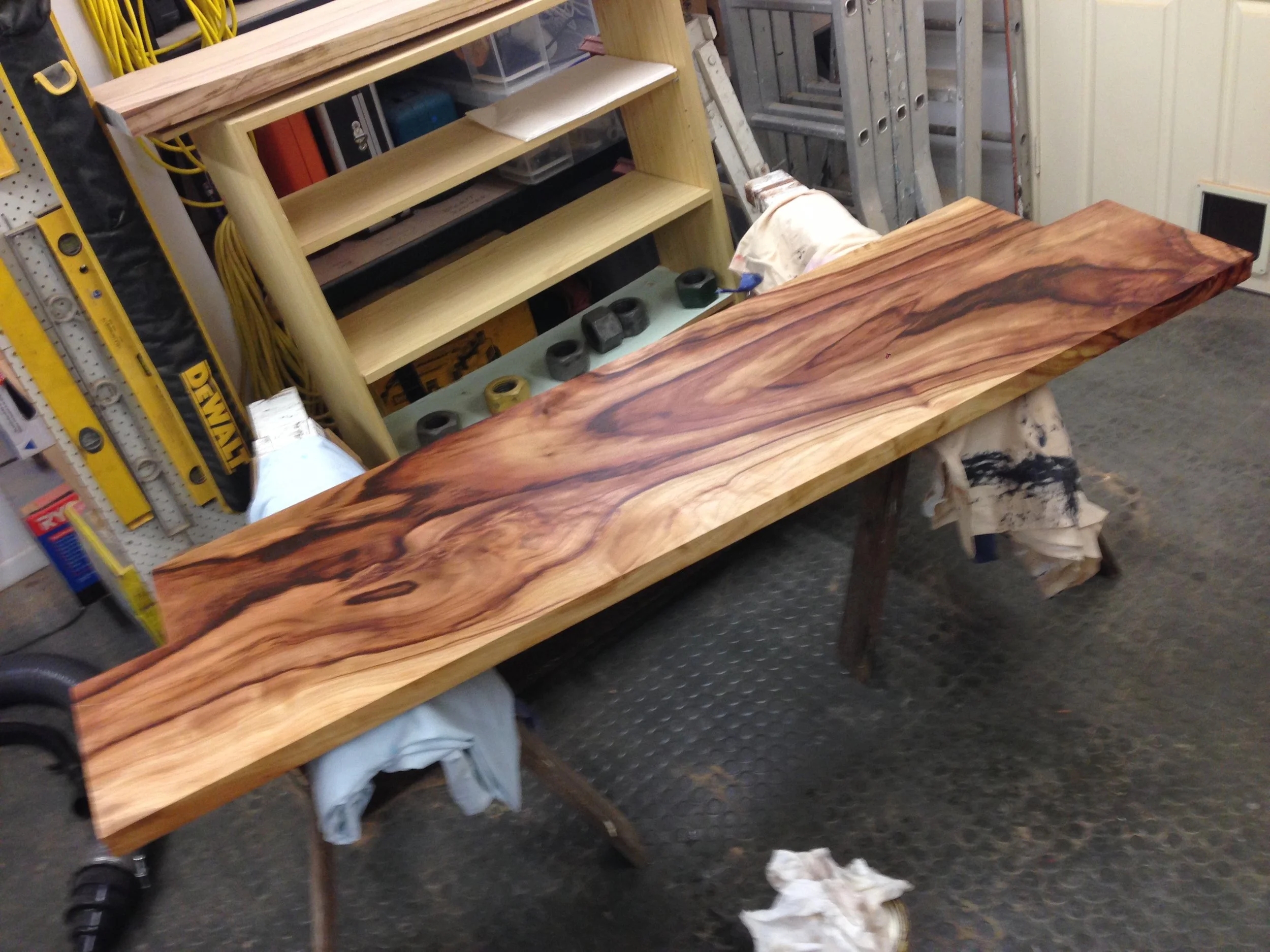 Constructed from 40mm thick Camphor Laurel, this slab was selected for the client for their new built-in entertainment unit. It was picked specifically for the amazing grain and colouring to tie in with the various colours contained in their reclaimed wood floor. This piece was finished with Danish oil before installation.