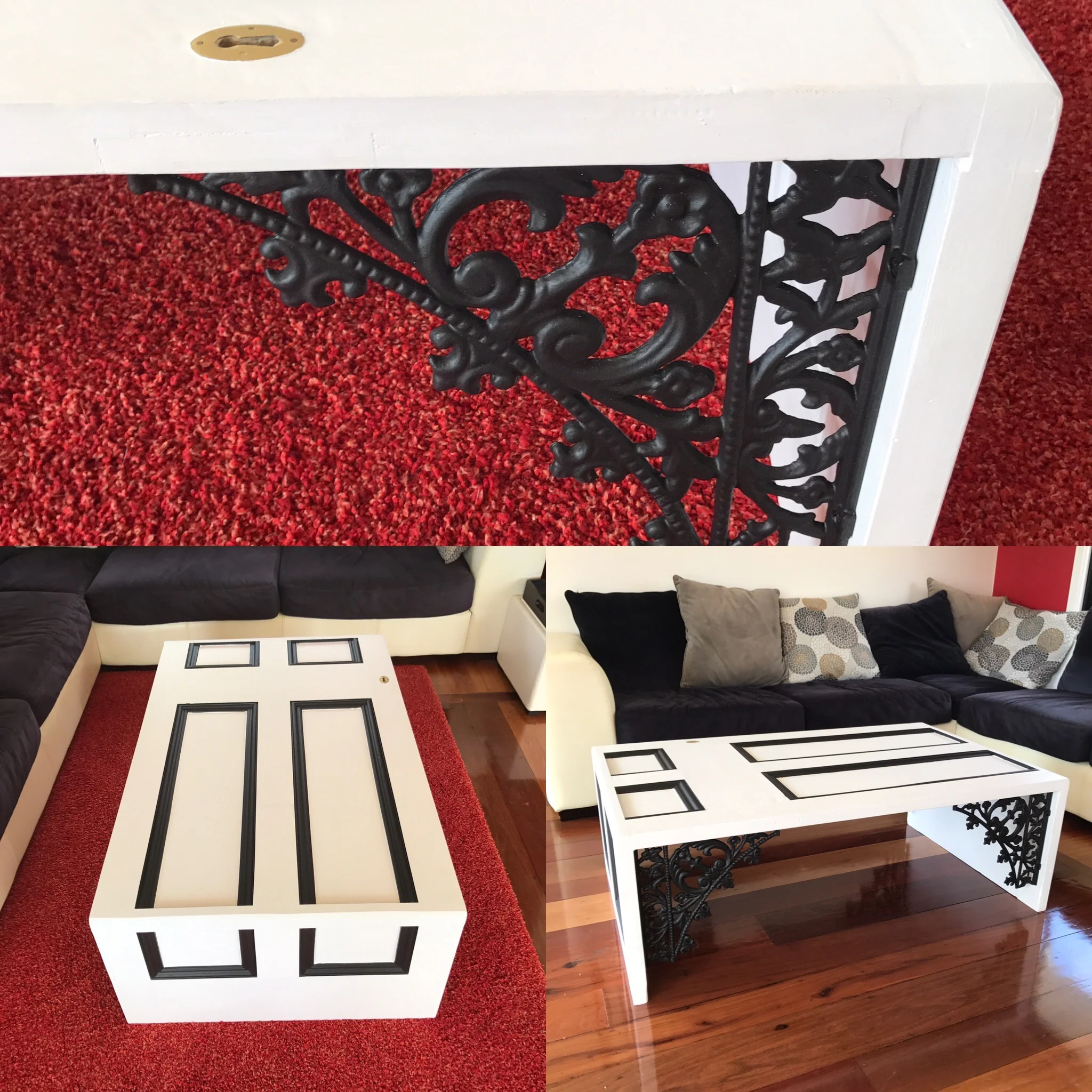 This one of a kind vintage style table is lovingly crafted from a reclaimed solid wood door that has been cut and "folded" to give the illusion from certain angles that it's still a flat door. With black accents and some of the original hardware retained, this table has ornate painted steel braces and comes with rubber feet installed so as to not to mark any surfaces. Dimensions are 1280mm long, 800mm wide, 450mm high. This piece has now sold but i'f you'd like a version made, please get in touch.